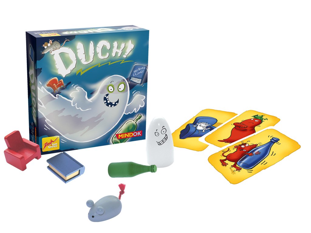 Bleskurychlá postřehová hra pro 2 - 8 hráčů. Myš! Kniha! Křeslo! Láhev! Duch! Ve hře je 5 různých dřevěných předmětů - bílý duch, zelená láhev, modrá kniha, červené křeslo a šedá myš. Na kartách jsou obrázky těchto předmětů, ovšem ne vždy ve správných barvách. Hra obsahuje 2 varianty - jednodušší a náročnější. Příklad: Na kartě je modrý duch a červená myš. Ve hře žádný modrý duch, ani červená myš nejsou. Cílem je tedy vzít (zelenou) láhev, protože na kartě není zobrazena ani láhev, ani zelená barva.