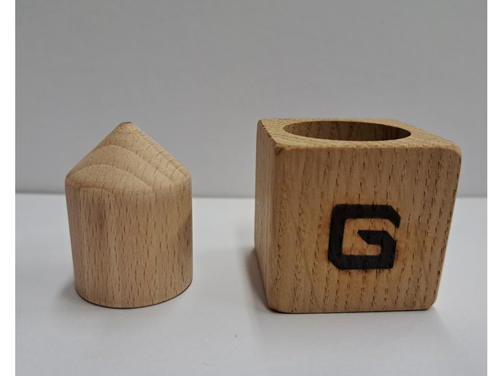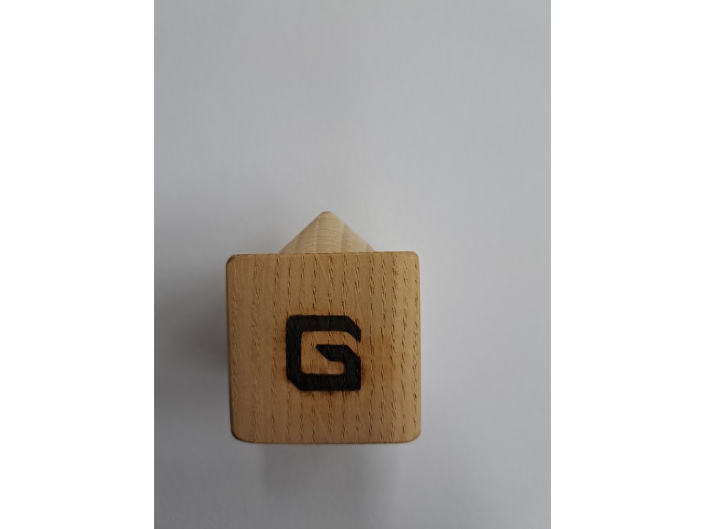 Hlavolam Geniátoru je vyrobený z dřeva, vypálená značka.