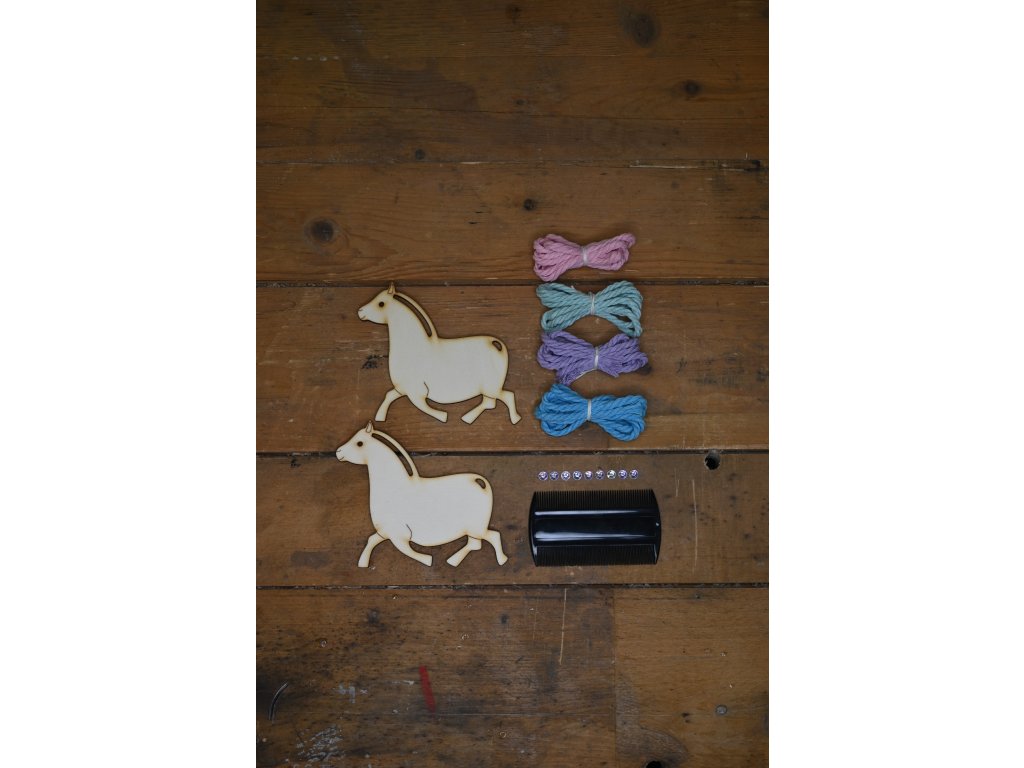 Sada obsahuje 2 dřevěné poníky s otvory pro vpletení hřívy a ocasu z macramé příze.