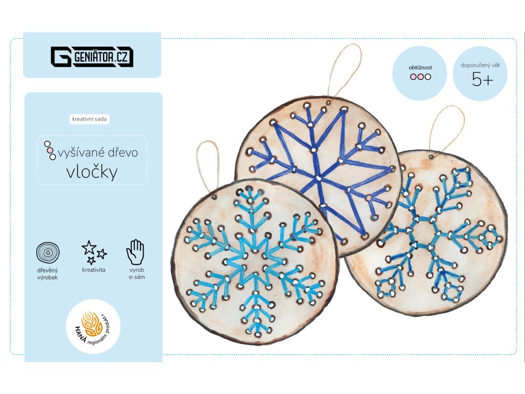 Vytvořte si krásnou originální dekoraci pomocí jednoduché vyšívací techniky. Tato kreativní sada obsahuje 3 dřevěné vločky s předvrtanými otvory, které jsou ideální i pro děti.