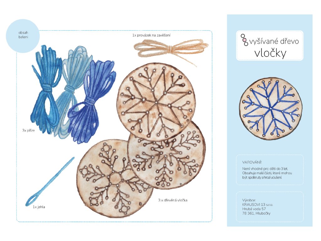 - 3 laserem vyřezáváné dřevěné vločky (vločka má průměr 13 cm)
